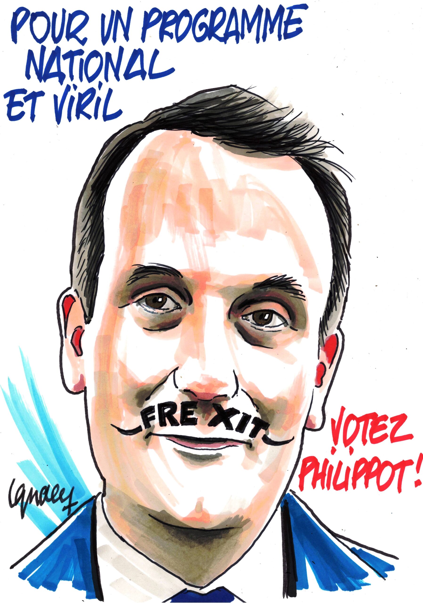 Vu que Florian était invité pour la troisième ou quatrième fois, pour éviter une nouvelle redite en portrait-caricature, j’ai voulu y mettre de la fantaisie, avec cette moustache qui contraste avec le sérieux du haut fonctionnaire qu’il est. J’ai aussi voulu rendre hommage à son côté “viril”  pour son soutien au Frexit.